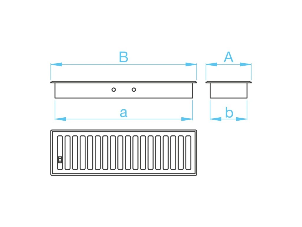 - Podlahové mřížky s pohyblivými lamelami vytváří vzduchový vějíř pokrývající šířku okna až do 2,5 m.